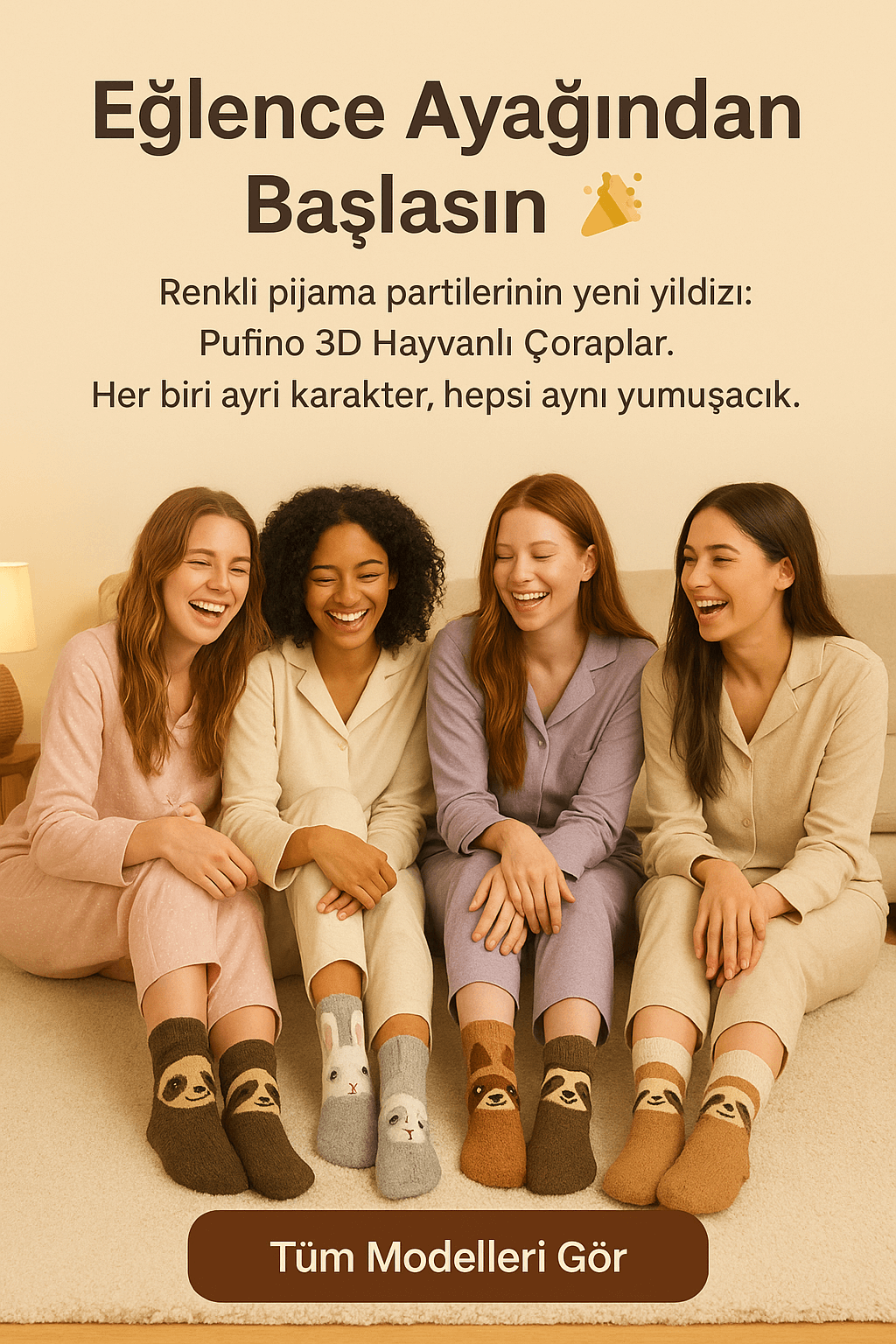 Kızlarla film gecesi yaptık, herkes çorabımı sordu 😂 Hem rahat hem de inanılmaz komik duruyorlar! Şimdi her pijama partisinde Pufi3D modası başladı